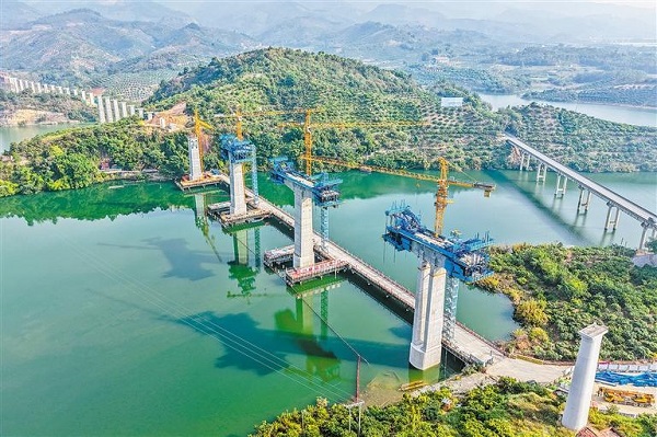 At the construction site of the Nameng Chengbi River Super Major Bridge in Youjiang district, Baise city, Guangxi, construction workers are seizing favorable winter weather conditions to accelerate progress.
