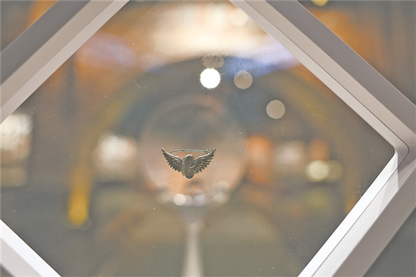 徽章是纯银材质,宽25毫米,高14毫米,厚1.3毫米,重3克。通过放大镜可以看到,其正面以一个直立的机车动轮为主体,两侧配以飞翼,组成“飞轮”图案,象征列车在铁道上飞驰,被形象地称为“飞轮”徽章。背面刻有“CHINA”(中国)标识及编号“669”。