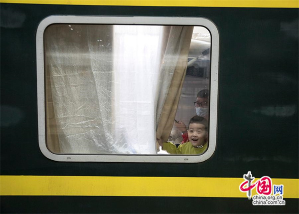 小朋友在车厢窗口期盼年味儿到来。中国网记者 马旷/摄