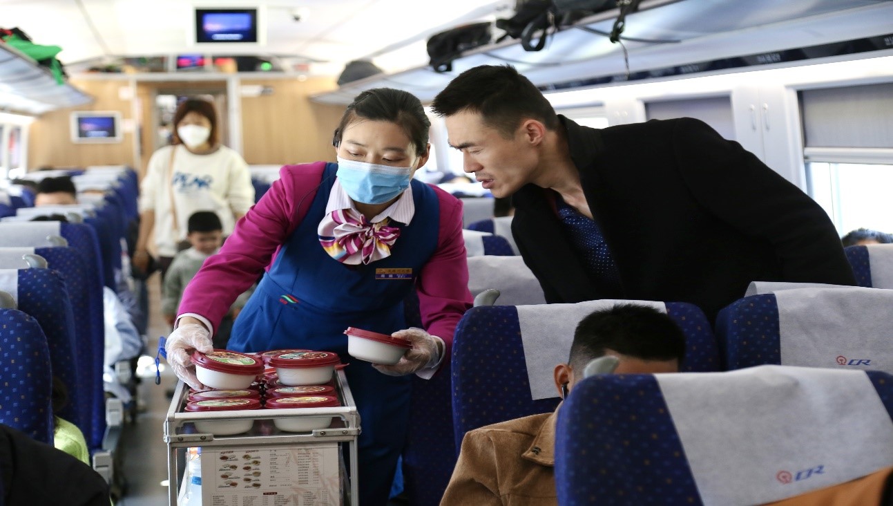 列车服务人员向旅客销售小碗菜